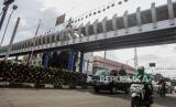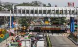 Pengendara melintas di dekat proyek pembangunan jembatan layang penghubung (Skybridge) antara Stasiun Bogor dan Stasiun Paledang di Kota Bogor, Jawa Barat, Kamis (30/11/2023). Balai Teknik Perkeretaapian (BTP) Bandung membangun jembatan layang penghubung sepanjang 200 meter dengan anggaran sebesar Rp 88 miliar dan ditargetkan selesai pada akhir 2023. (FOTO : Republika/Putra M. Akbar)