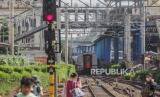 Kereta lokomotif melintas di dekat proyek pembangunan jembatan layang penghubung (Skybridge) antara Stasiun Bogor dan Stasiun Paledang di Kota Bogor, Jawa Barat, Kamis (30/11/2023). Balai Teknik Perkeretaapian (BTP) Bandung membangun jembatan layang penghubung sepanjang 200 meter dengan anggaran sebesar Rp 88 miliar dan ditargetkan selesai pada akhir 2023. (FOTO : Republika/Putra M. Akbar)