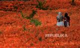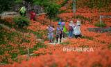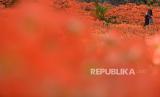 Pengunjung melihat Bunga Amarilis yang bermekaran di Gunungkidul, Yogyakarta, Kamis (30/11/2023). Setiap memasuki awal musim penghujan kebun Bunga Amarilis milik Sukadi menjadi salah satu tujuan wisata sejak 2015. Pengunjung dengan membayar retribusi masuk Rp 10 ribu bisa melihat dan berswafoto di hamparan Bunga Amarilis. Lama mekarnya bunga sekitar dua Minggu dan waktunya biasanya sekitar akhir November hingga awal Desember. Menurut pemilik, Sukadi saat ini di kebunnya memiliki dua juta umbi Bunga Amarilis dengan jumlah tangkai sekitar 4 juta tangkai bunga. (FOTO : Republika/Wihdan Hidayat)