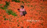 Pengunjung memotret dengan gawai Bunga Amarilis yang bermekaran di Gunungkidul, Yogyakarta, Kamis (30/11/2023). Setiap memasuki awal musim penghujan kebun Bunga Amarilis milik Sukadi menjadi salah satu tujuan wisata sejak 2015. Pengunjung dengan membayar retribusi masuk Rp 10 ribu bisa melihat dan berswafoto di hamparan Bunga Amarilis. Lama mekarnya bunga sekitar dua Minggu dan waktunya biasanya sekitar akhir November hingga awal Desember. Menurut pemilik, Sukadi saat ini di kebunnya memiliki dua juta umbi Bunga Amarilis dengan jumlah tangkai sekitar 4 juta tangkai bunga. (FOTO : Republika/Wihdan Hidayat)