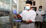 Petugas laboratorium Lembaga Pengkajian Pangan, Obat-obatan dan Kosmetika (LPPOM) Majelis Permusyawaratan Ulama (MPU) Aceh memeriksa produk kosmetik dan makanan di Aceh Besar, Aceh, Kamis (30/11/2023).MPU Aceh memberikan layanan gratis kepada pengusaha industri, UKM dan UMKM untuk mengurus sertifikasi halal sebagai upaya perlindungan usaha serta kepastian produk halal dikonsumsi oleh masyarakat. (FOTO : ANTARA FOTO/Irwansyah Putra)