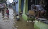 Warga beraktivitas di genangan air saat banjir di Kampung Bojongasih, Dayeuhkolot, Kabupaten Bandung, Jawa Barat, Jumat (1/12/2023). Banjir akibat intensitas curah hujan yang tinggi dan meluapnya sungai Citarum tersebut menyebabkan ratusan rumah di Kampung Bojongasih, Kabupaten Bandung terendam banjir setinggi 10 hingga 60 sentimeter. (FOTO : REPUBLIKA/ABDAN SYAKURA)