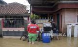 Pedagang melayani pembeli saat banjir di Kampung Bojongasih, Dayeuhkolot, Kabupaten Bandung, Jawa Barat, Jumat (1/12/2023). Banjir akibat intensitas curah hujan yang tinggi dan meluapnya sungai Citarum tersebut menyebabkan ratusan rumah di Kampung Bojongasih, Kabupaten Bandung terendam banjir setinggi 10 hingga 60 sentimeter. (FOTO : REPUBLIKA/ABDAN SYAKURA)
