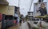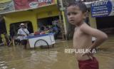 Seorang anak melintasi genangan air saat banjir di Kampung Bojongasih, Dayeuhkolot, Kabupaten Bandung, Jawa Barat, Jumat (1/12/2023). Banjir akibat intensitas curah hujan yang tinggi dan meluapnya sungai Citarum tersebut menyebabkan ratusan rumah di Kampung Bojongasih, Kabupaten Bandung terendam banjir setinggi 10 hingga 60 sentimeter. (FOTO : REPUBLIKA/ABDAN SYAKURA)
