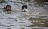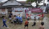 Sejumlah anak bermain di genangan air saat banjir di Kampung Bojongasih, Dayeuhkolot, Kabupaten Bandung, Jawa Barat, Jumat (1/12/2023). Banjir akibat intensitas curah hujan yang tinggi dan meluapnya sungai Citarum tersebut menyebabkan ratusan rumah di Kampung Bojongasih, Kabupaten Bandung terendam banjir setinggi 10 hingga 60 sentimeter. (FOTO : REPUBLIKA/ABDAN SYAKURA)