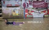 Seorang anak bermain di genangan air saat banjir di Kampung Bojongasih, Dayeuhkolot, Kabupaten Bandung, Jawa Barat, Jumat (1/12/2023). Banjir akibat intensitas curah hujan yang tinggi dan meluapnya sungai Citarum tersebut menyebabkan ratusan rumah di Kampung Bojongasih, Kabupaten Bandung terendam banjir setinggi 10 hingga 60 sentimeter. (FOTO : REPUBLIKA/ABDAN SYAKURA)