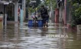 REPUBLIKA.CO.ID, KAB BANDUNG -- Warga melintasi genangan air saat banjir di Kampung Bojongasih, Dayeuhkolot, Kabupaten Bandung, Jawa Barat, Jumat (1/12/2023). Banjir akibat intensitas curah hujan yang tinggi dan meluapnya sungai Citarum tersebut menyebabkan ratusan rumah di Kampung Bojongasih, Kabupaten Bandung terendam banjir setinggi 10 hingga 60 sentimeter.