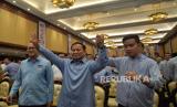 REPUBLIKA.CO.ID, JAKARTA. -- Pasangan capres-cawapres no urut 2 Prabowo Subianto-Gibran Rakabuming Raka didampingi Ketua Tim Kampanye Nasional (TKN) Prabowo-Gibran Rosan Perkasa Roeslani saat menghadiri Rakornas TKN-TKD Prabowo-Gibran di Jakarta, Jumat (1/12/2023).