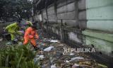 Petugas membersihkan sampah yang menyumbat aliran drainase saat banjir di kawasan Gedebage, Bandung, Jawa Barat, Jumat (1/12/2023). Kawasan tersebut kerap dilanda banjir akibat drainase yang buruk saat intensitas curah hujan yang tinggi. Genangan banjir tersebut mengganggu akses lalu lintas dan merendam sebagian kawasan Pasar Gedebage. (FOTO : REPUBLIKA/ABDAN SYAKURA)