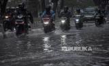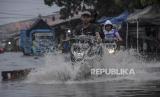 REPUBLIKA.CO.ID, GEDEBAGE. -- Pengendara melintasi genangan banjir di Pasar Gedebage, Bandung, Jawa Barat, Jumat (1/12/2023).