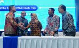 Direktur Utama Theodorus Ardi Hartoko (tengah), Direktur Bisnis Agus Winarno, Direktur Keuangan dan Manajemen Risiko Ian Sigit Kurniawan, Direktur Operasi dan Pembangunan Hastining Bagyo Astuti dan Direktur Investasi Hendra Purnama (kiri ke kanan) berfoto bersama usai acara Rapat Umum Pemegang Saham Luar Biasa (RUPSLB) di Jakarta, Jumat (1/12/2023), Perseroan menyetujui pengangkatan Yusuf WIbisono sebagai Komisaris Utama, Mira Tayyiba sebagai Komisaris dan Gunawan Susanto sebagai Komisaris Independen. (FOTO : Republika/Thoudy Badai)