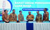 Komisaris Utama PT Dayamitra Telekomunikasi Tbk, Yusuf Wibisono (kedua kanan) bersama Komisaris Mira Tayyiba, Komisaris Independen M. Ridwan Rizqi Ramadhani Nasution , Komisaris Independen Gunawan Susanto, Komisari Herlan Wijanarko, Direktur Utama Theodorus Ardi Hartoko (kiri ke kanan) berbincang disela acara Rapat Umum Pemegang Saham Luar Biasa (RUPSLB) di Jakarta, Jumat (1/12/2023), Perseroan menyetujui pengangkatan Yusuf WIbisono sebagai Komisaris Utama, Mira Tayyiba sebagai Komisaris dan Gunawan Susanto sebagai Komisaris Independen. (FOTO : Republika/Thoudy Badai)