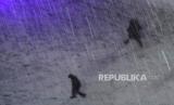 Orang-orang berjalan melintasi lapangan yang tertutup salju sebelum pertandingan sepak bola perguruan tinggi NCAA antara Iowa State dan Kansas State setelah badai musim dingin menumpahkan sekitar 4 inci salju di Manhattan, Kansas, AS. beberapa waktulalu. (FOTO : AP Photo/Charlie Riedel)