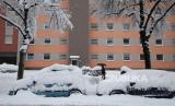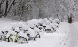 Pemandangan sepeda yang diparkir tertutup salju tebal di Munich, sehingga menghentikan penerbangan dan jalur kereta api. Salju diperkirakan akan terus berlanjut sepanjang hari di Jerman Selatan hingga tenggara yang saat ini ketebalan mencapai 20 hingga 40 cm.