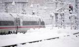 Sebuah kereta api diparkir di stasiun pusat setelah hujan salju lebat di Munich, Jerman, Sabtu, (2/12/2023). (FOTO : AP Photo/Matthias Schrader)
