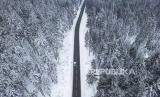 Sebuah mobil melaju di sepanjang pepohonan yang tertutup salju di jalan pedesaan di Niederreifenberg, Jerman, Rabu (29/12/2023). (FOTO : Boris Roessler/dpa via AP)
