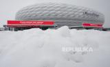 Sebuah papan di stadion Munich Allianz, Jerman, bertuliskan Stadion ditutup, Pertandingan dibatalkan antara Bayern Munich dan 1. FC Union Berlin dibatalkan karena salju. Sabtu, (2/12/2023). (FOTO : Sven Hoppe/dpa via AP)