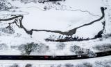 Mobil berkendara menyusuri padang rumput yang tertutup salju dengan sungai kecil di kawasan Taunus di Schmitten, Jerman, Rabu, (29/11/2023). (FOTO : AP Photo/Michael Probst)