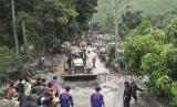 REPUBLIKA.CO.ID, SIMANGULAMPE. -- Petugas penyelamat menggunakan alat berat untuk membersihkan jalan dari batu dan lumpur menyusul tanah longsor di desa Simangulampe, Sumatera Utara, Sabtu, (2/12/2023).