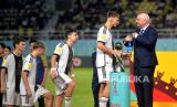 Pemain Timnas U17 Jerman mencoba menenangkan rekannya saat adu pinalti melawan Timnas U17 Perancis pada pertandingan Final Piala Dunia U17 2023 di Stadion Manahan, Surakarta, Jawa Tengah, Sabtu (2/12/2023). Jerman berhasil memenangkan Piala Dunia U17 untuk pertama kalinya usai mengalahkan Perancis melalui adu pinalti 4-3 (2-2). Jerman pada babak kedua bermain dengan 10 pemain usai Osawe mendapat kartu merah pada menit ke 69. (FOTO : Republika/Wihdan Hidayat)