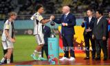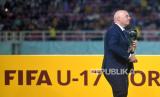 Presiden FIFA Gianni Infantino membawa thropy untuk Timnas U17 Jerman saat penyerahan Thropy Piala Dunia U17 2023 di Stadion Manahan, Surakarta, Jawa Tengah, Sabtu (2/12/2023). Jerman berhasil memenangkan Piala Dunia U17 untuk pertama kalinya usai mengalahkan Perancis melalui adu pinalti 4-3 (2-2). Jerman pada babak kedua bermain dengan 10 pemain usai Osawe mendapat kartu merah pada menit ke 69. (FOTO : Republika/Wihdan Hidayat)