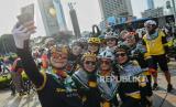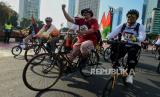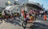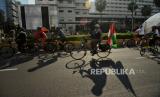 Komunitas sepeda bersama warga mengikuti kegiatan Gowes For Palestine di jalur Hari Bebas Kendaraan Bermotor (HBKB), Jalan Sudirman-Thamrin, Jakarta, Ahad (3/12/2023). Kegitan tersebut sebagai bentuk kepedulian terhadap warga Palestina. Selain itu, mereka juga menggelar doa bersama dan donasi untuk Palestina. (FOTO : Republika/Thoudy Badai)