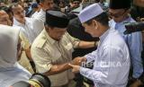 Calon presiden nomor urut 2 Prabowo Subianto (kiri) berjabat tangan dengan KH Tubagus Ahmad Syadzili (kanan) saat kampanye di Kawasan Masjid Agung Banten, Kota Serang, Banten, Ahad (3/12/2023). (FOTO : ANTARA FOTO/Galih Pradipta)