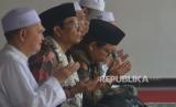 Calon wakil presiden nomor urut 3 Mahfud MD (kedua kiri) saat ziarah dan doa bersama di pusara Pahlawan Nasional KH R Asad Syamsul Arifin di Pondok Pesantren (ponpes) Salafiyah Syafi