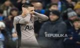 Giovani Lo Celso dari Tottenham (kiri) mencetak gol kedua timnya saat pertandingan sepak bola Liga Premier Inggris antara Manchester City dan Tottenham Hotspur di stadion Etihad di Manchester, Inggris, Ahad (3/12/2023)malam WIB. (FOTO : AP Photo/Dave Thompson)