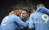 Jack Grealish dari Manchester City (tengah) selebrasi bersama rekan satu timnya setelah mencetak gol timnya selama pertandingan sepak bola Liga Premier Inggris antara Manchester City dan Tottenham Hotspur di stadion Etihad di Manchester, Inggris, Ahad (3/12/2023)malam WIB. (FOTO : AP Photo/Dave Thompson)