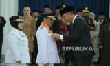 Penjabat Gubernur Jawa Barat (Jabar) Bey Machmudin melantik Aep Syaepuloh sebagai Bupati Karawang menggantikan Cellica Nurracahdiana yang meletakkan jabatannya karena mencalonkan diri sebagai Anggota DPR RI, di Aula Barat Gedung Sate, Senin (4/12/2023). (FOTO : Republika/Edi Yusuf)