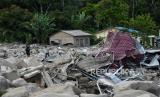 REPUBLIKA.CO.ID, SUMUT -- Petugas SAR menggunakan alat berat menyingkirkan material batu akibat bencana tanah longsor di Desa Simangulampe, Humbang Hasundutan, Sumatera Utara, Senin (4/12/2023). Berdasarkan data Badan SAR Nasional (Basarnas), sebanyak 41 rumah rusak, dua orang meninggal dunia dan 10 orang dinyatakan hilang akibat musibah banjir dan tanah longsor yang melanda kawasan tersebut pada Sabtu (2/12).