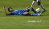 Gelandang Persib Bandung Edo F (kiri) terjatuh usai dijegal pemain PSM Makassar dalam pertandingan lanjutan BRI Liga 1 2023-2024 di Stadion Gelora Bandung Lautan Api (GBLA), Gedebage, Bandung, Jawa Barat, Senin (4/12/2023). Dalam pertandingan tersebut Persib Bandung ditahan imbang oleh PSM Makassar dengan skor akhir 0-0. (FOTO : REPUBLIKA/ABDAN SYAKURA)