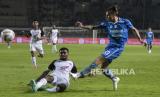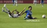 Gelandang Persib Bandung Edo F (kanan) terjatuh usai dijegal bek PSM Makassar Safrudin Tahar (kiri) dalam pertandingan lanjutan BRI Liga 1 2023-2024 di Stadion Gelora Bandung Lautan Api (GBLA), Gedebage, Bandung, Jawa Barat, Senin (4/12/2023). Dalam pertandingan tersebut Persib Bandung ditahan imbang oleh PSM Makassar dengan skor akhir 0-0. (FOTO : REPUBLIKA/ABDAN SYAKURA)