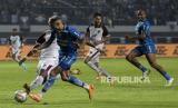 Gelandang Persib Bandung Edo F (kiri) berebut bola dengan bek PSM Makassar Yuran Fernandes (kanan) dalam pertandingan lanjutan BRI Liga 1 2023-2024 di Stadion Gelora Bandung Lautan Api (GBLA), Gedebage, Bandung, Jawa Barat, Senin (4/12/2023). Dalam pertandingan tersebut Persib Bandung ditahan imbang oleh PSM Makassar dengan skor akhir 0-0. (FOTO : REPUBLIKA/ABDAN SYAKURA)