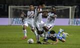 Penyerang Persib Bandung Ciro Alves (kedua kiri) berebut bola dengan pemain PSM Makassar dalam pertandingan lanjutan BRI Liga 1 2023-2024 di Stadion Gelora Bandung Lautan Api (GBLA), Gedebage, Bandung, Jawa Barat, Senin (4/12/2023). Dalam pertandingan tersebut Persib Bandung ditahan imbang oleh PSM Makassar dengan skor akhir 0-0. (FOTO : REPUBLIKA/ABDAN SYAKURA)