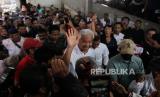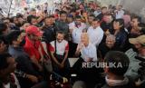 Calon Presiden nomor urut tiga Ganjar Pranowo menyapa warga saat melakukan kampanye di Pasar Baru Klandasan Ilir, Balikpapan, Kalimantan Timur, Selasa (5/12/2023). Pada kampanye tersebut Ganjar Pranowo berdialog dengan pedagang terkait harga komoditas pangan seperti cabai dan tempe. (FOTO : Republika/Putra M. Akbar)