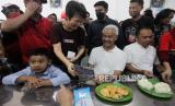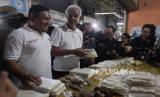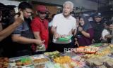 Calon Presiden nomor urut tiga Ganjar Pranowo membeli kue saat melakukan kampanye di Pasar Baru Klandasan Ilir, Balikpapan, Kalimantan Timur, Selasa (5/12/2023). Pada kampanye tersebut Ganjar Pranowo berdialog dengan pedagang terkait harga komoditas pangan seperti cabai dan tempe. (FOTO : Republika/Putra M. Akbar)