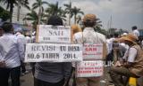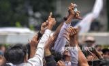 Sejumlah perangkat desa berebut mengambil uang yang di bagikan oleh rekan mereka saat unjuk rasa di depan Gedung DPR, Senayan, Jakarta, Selasa (5/12/2023). Mereka mendesak DPR untuk segera mengesahkan revisi UU No. 6 Tahun 2014 tentang Desa. (FOTO : Republika/Prayogi)