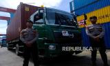 Petugas kepolisian bersiaga di depan truk pengangkut kontainer berisi logistik Pemilu 2024 saat pelepasan perdana di Pelabuhan Dwikora, Pontianak, Kalimantan Barat, Selasa (5/12/2023). KPU Kalimantan Barat melakukan pelepasan perdana enam kontainer berisi logistik utama Pemilu 2024 berupa surat suara DPR RI, DPRD provinsi dan DPRD kabupaten/kota menuju 10 kabupaten/kota di wilayah Kalimantan Barat.  (FOTO : ANTARA FOTO/Jessica Wuysang)