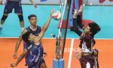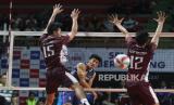 REPUBLIKA.CO.ID,KEDIRI -- Pebola voli BIN Pasundan Farhan Halim (kanan) menahan serangan dari pebola voli Indomaret Rendy Verdian Licardo (kiri) pada pertandingan Final Four Livoli Divisi Utama di GOR Jayabaya, Kota Kediri, Jawa Timur, Selasa (5/12/2023). BIN Pasundan menang atas Indomaret dengan skor 3-1 (25-22, 25-27, 25-18, dan 25-21).