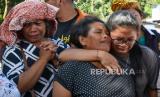 Sejumlah keluarga korban menangis saat tiba di lokasi bencana tanah longsor di Desa Simangulampe, Humbang Hasundutan, Sumatera Utara, Selasa (5/12/2023). Sebanyak 539 personel dari TNI, Polri, Basarnas, BPBD dan Damkar dikerahkan untuk mencari 10 orang yang masih dinyatakan hilang akibat musibah banjir dan tanah longsor yang melanda kawasan tersebut pada Sabtu (2/12). (FOTO : Antara/Fransisco Carollio)
