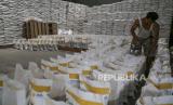 REPUBLIKA.CO.ID,SUKABUMI -- Pekerja mengemas karung beras di gudang Bulog Pasirhalang, Sukaraja, Kabupaten Sukabumi, Jawa Barat, Selasa (5/12/2023).
