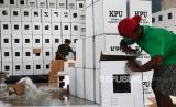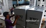 Pekerja menata kotak suara Pemilu 2024 setelah dirakit di gudang logistik KPU di Wisma Haji Kota Madiun, Jawa Timur, Rabu (6/12/2023). Komisi Pemilihan Umum (KPU) Kota Madiun menyiapkan 2.926 kota suara yang akan digunakan untuk pelaksanaan Pemilu 2024. (FOTO : Antara/Siswowidodo )