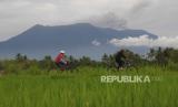 Pengendara sepeda melintas saat Gunung Marapi memuntahkan material vulkanik ke udara di Agam, Sumatera Barat, Indonesia, Rabu (6/12/2023). Tim penyelamat sedang mencari seorang pendaki wanita yang terjebak dalam letusan gunung berapi di akhir pekan yang menewaskan hampir dua belas pendaki dan melukai beberapa lainnya. (FOTO : AP Photo/Ardhy Fenando)
