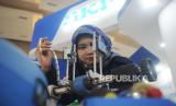 Teknisi wanita sedang memperlihatkan suku cadang dalam pameran Manufacturing Indonesia 2023, di JIExpo Kemayoran, Jakarta, Kamis (7/12/2023). Di pameran peralatan pengolahan internasional terbesar di Asia ini, SKF menampilkan jajaran solusi berbasis Intelligent and Clean untuk mendukung para pelaku industri di Indonesia meningkatkan produktivitas dan daya saing. SKF mengikutsertakan engineer perempuan dalam industri pengolahan sebagai figur inspiratif. (FOTO : Republika/Tahta Aidilla)