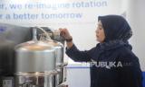 Teknisi wanita sedang melakukan setting alat Recondoil dalam pameran Manufacturing Indonesia 2023, di JIExpo Kemayoran, Jakarta, Kamis (7/12/2023). Di pameran peralatan pengolahan internasional terbesar di Asia ini, SKF menampilkan jajaran solusi berbasis Intelligent and Clean untuk mendukung para pelaku industri di Indonesia meningkatkan produktivitas dan daya saing. SKF mengikutsertakan engineer perempuan dalam industri pengolahan sebagai figur inspiratif. (FOTO : Republika/Tahta Aidilla)