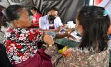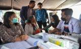 Dokter memeriksa kesehatan warga korban bencana tanah longsor di halaman Kantor Camat Baktiraja, Humbang Hasundutan, Sumatera Utara, Kamis (7/12/2023). Layanan pengobatan gratis tersebut disediakan untuk pengungsi dan relawan yang mulai terserang berbagai penyakit seperti hipertensi, trauma dan ispa pada hari keenam bencana tanah longsor di kawasan tersebut. (FOTO : ANTARA FOTO/Fransisco Carolio)