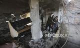 Warga Palestina memeriksa rumah yang hancur akibat bombardir pasukan zionis Israel di Rafah, Jalur Gaza, Kamis (7/12/2023). (FOTO : AP Photo/Hatem Ali)