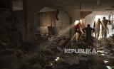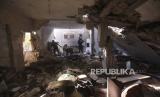 Warga Palestina memeriksa rumah yang hancur akibat bombardir pasukan zionis Israel di Rafah, Jalur Gaza, Kamis (7/12/2023). (FOTO : AP Photo/Fatima Shbair)